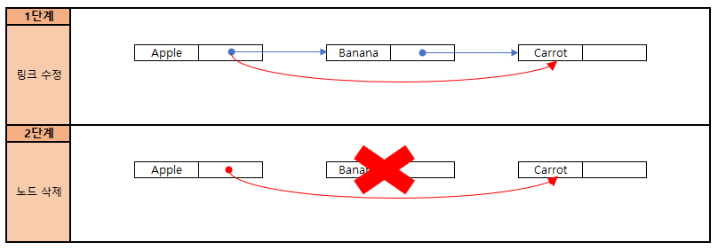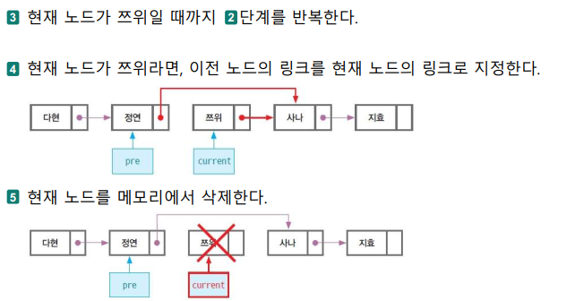 - 1단계 : 삭제할 노드의 바로 앞 노드 링크를 수정한다.