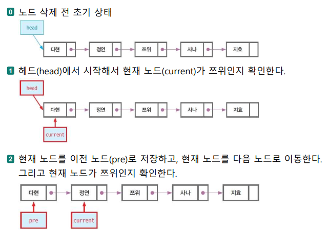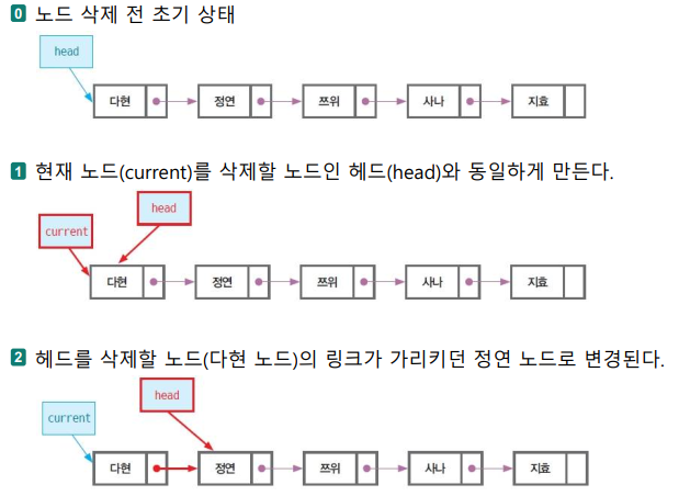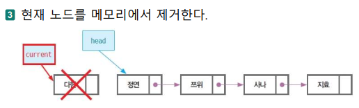 - 삭제할 노드의 링크를 바로 앞 노드의 링크로 복사하여 앞 노드가 삭제할 노드의 다음 노드를 가리키게 한다.
