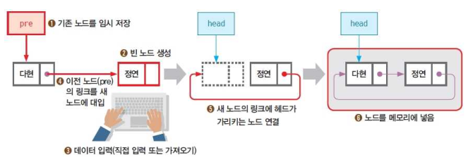 - 새 노드를 기준 노드의 링크에 저장하기 전에 기존 노드를 잠시 저장한 후 생성해야 한다.