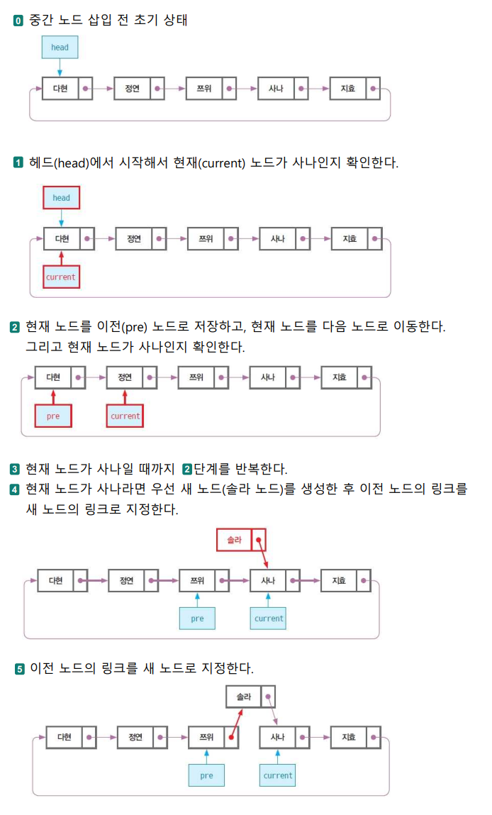 - 원형 연결 리스트에서 중간 노드를 삽입하는 과정은 단순 연결 리스트의 과정과 방식이 동일하다.