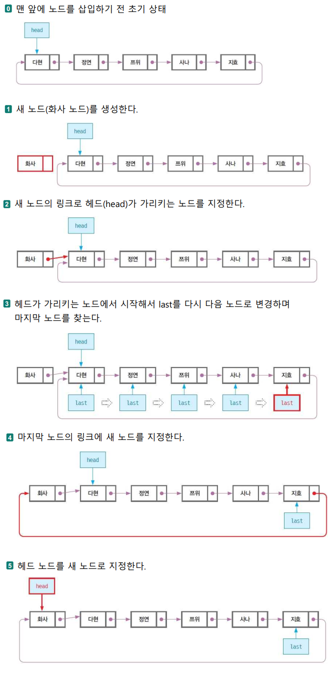 - 그리고 새 노드의 링크에 헤드가 가리키는 노드를 연결함으로써 원형 연결 리스트의 구조를 유지해야 한다.