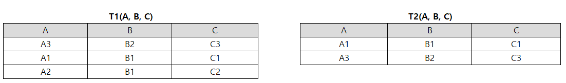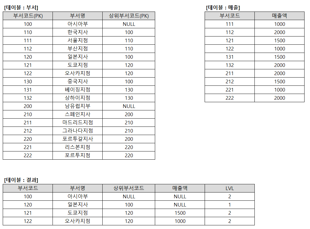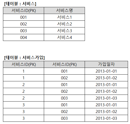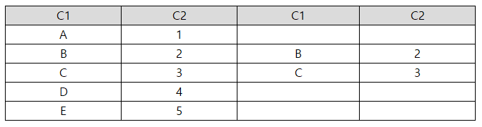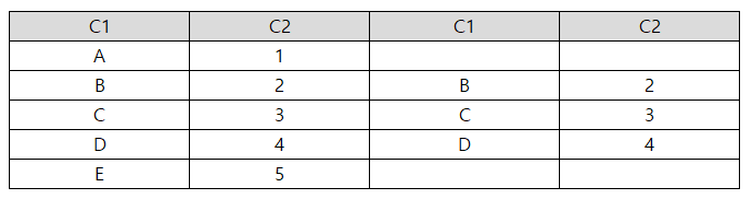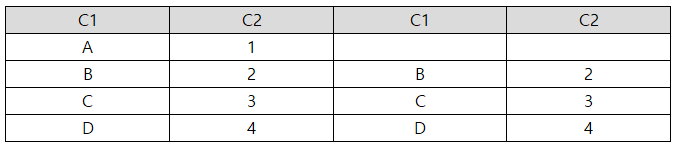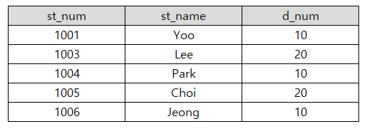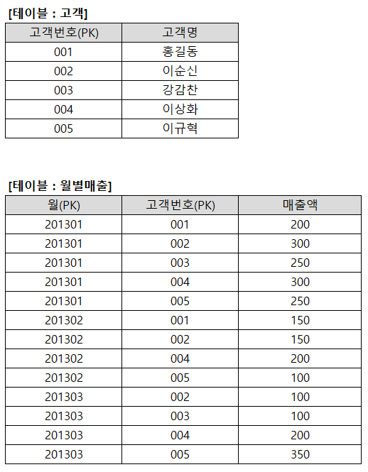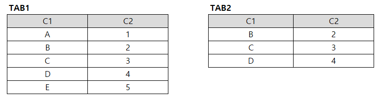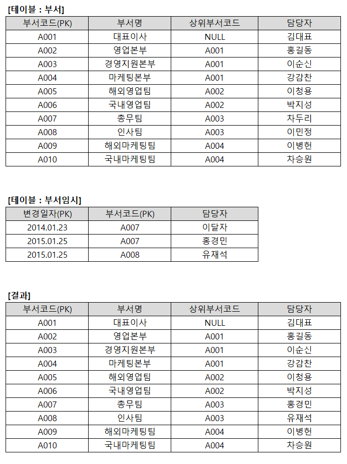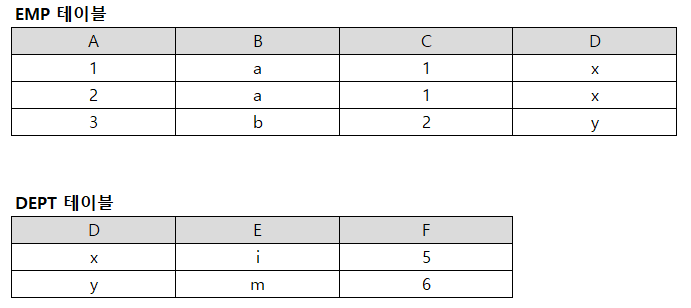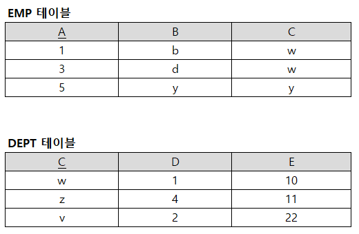 Q. 다음 중 아래 테이블들을 대상으로 SQL 문장을 수행한 결과로 가장 적절한 것은?