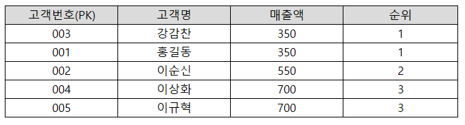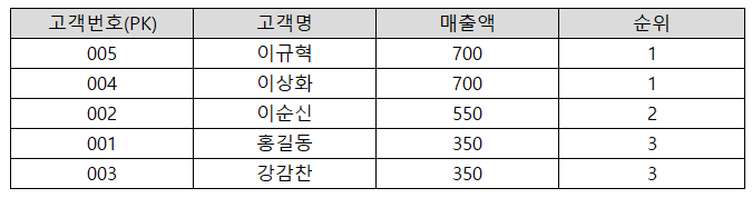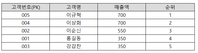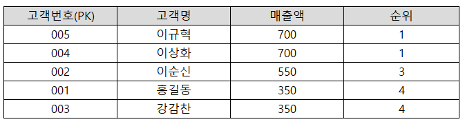 FROM (SELECT RANK() OVER(ORDER BY 활동점수 DESC) AS 순위, 고객ID, 게임상품ID, 활동점수