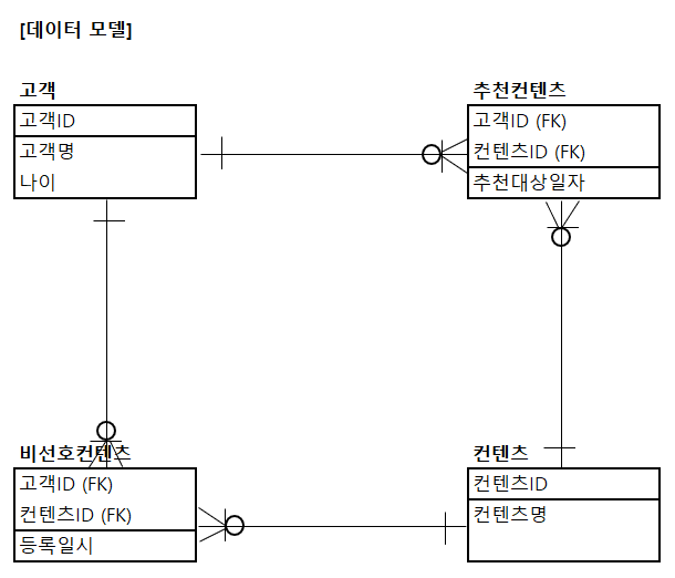 [설명] 우리는 매일 배치작업을 통하여 고객에게 추천할 컨텐츠를 생성하고 고객에게 추천 서비스를 제공한다. 추천 컨텐츠 엔티티에서 언제 추천을 해야 하는지를 정의하는 추천 대상일자가 있어 해당일자에만 컨텐츠를 추천해야 한다. 또한 고객이 컨텐츠를 추천 받았을 때 선호하는 커텐츠가 아닌 경우에는 고객이 비선호 컨텐츠로 분류하여 더 이상 추천 받기를 원하지 않는다. 그러므로 우리는 비선호 컨텐츠 엔티티에 등록된 데이터에 대해서는 추천을 수행하지 않아야 한다.