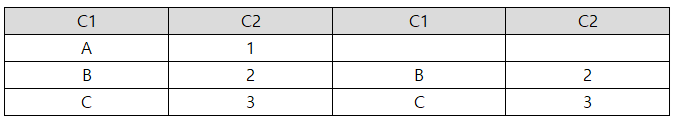 Q. 아래의 사례1은 Cartesian Product를 만들기 위한 SQL 문장이며 사례1과 같은 결과를 얻기 위해 사례2 SQL 문장의 ( ㄱ ) 안에 들어갈 내용을 작성하시오.