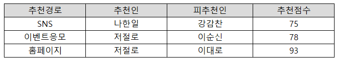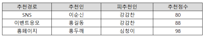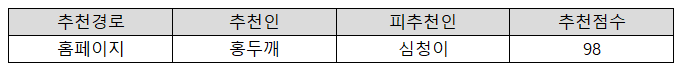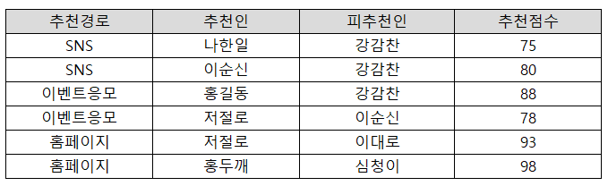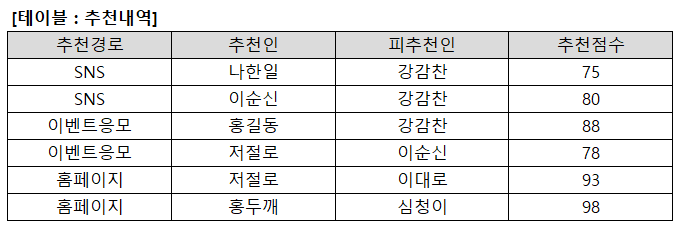 FROM (SELECT 추천경로, 추천인, 피추천인, 추천점수,