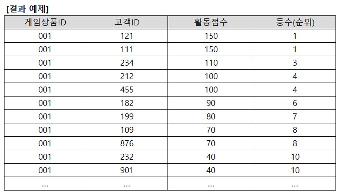 FROM (SELECT RANK() OVER(PARTITION BY 게임상품ID ORDER BY 활동점수 DESC) AS 순위,