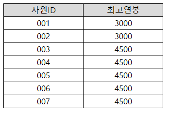 이를 다시 사원 테이블과 사원ID = 사원ID AND 최고연봉 = 연봉 으로 JOIN을 하게 되면 부서별 최고연봉의 사원이 출력된다.