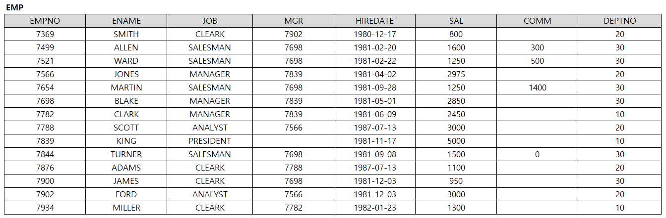 Q. 다음 중 아래 데이터 모델을 참고하여 설명에 맞게 올바르게 작성한 SQL 문장을 2개 고르시오.
