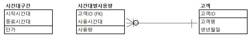 Q. 아래는 어느 회사의 정산 데이터 모델의 일부이며 고객이 서비스를 사용한 시간대에 따라 차등 단가를 적용하려고 한다. 다음 중 시간대별사용량 테이블을 기반으로 고객별 사용금액을 추출하는 SQL으로 가장 적절한 것은?