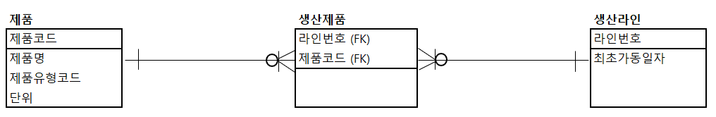 ③ 데이터 모델을 보면 제품과 생산라인 엔티티에는 생산제품과 대응하지 않는 레코드가 있을 수 있다. ④ 특정 생산라인에서 생산되는 제품의 제품명을 알기 위해서는 제품과 생산제품까지 2개의 엔티티만을 Inner Join 하면 된다.
