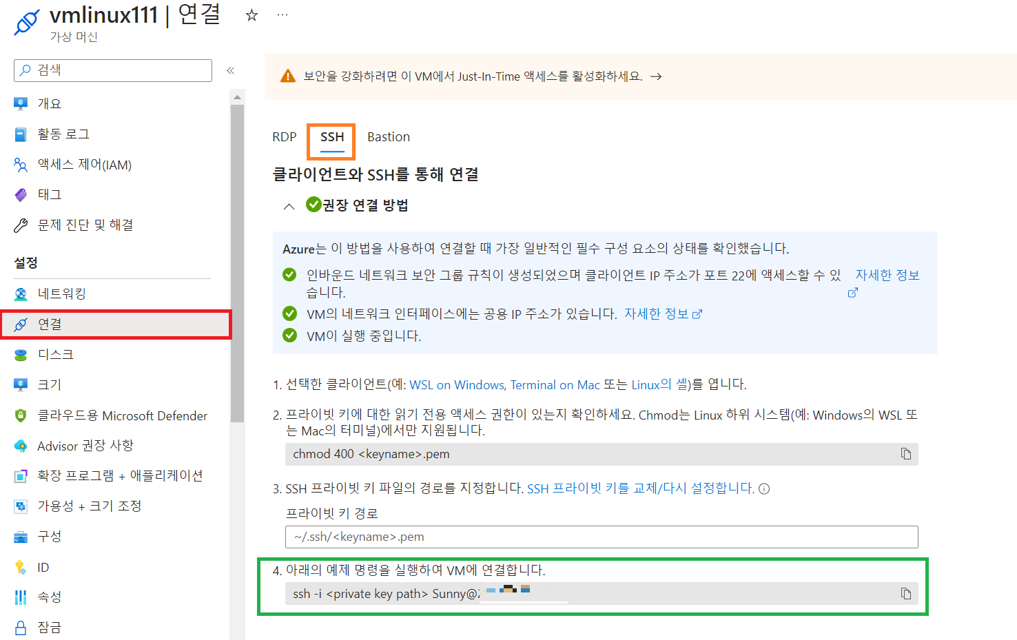 - [설정] > [연결] 탭을 클릭한 후, [SSH] 항목에서 4번 항목을 확인한다. (myuser@IP주소)
