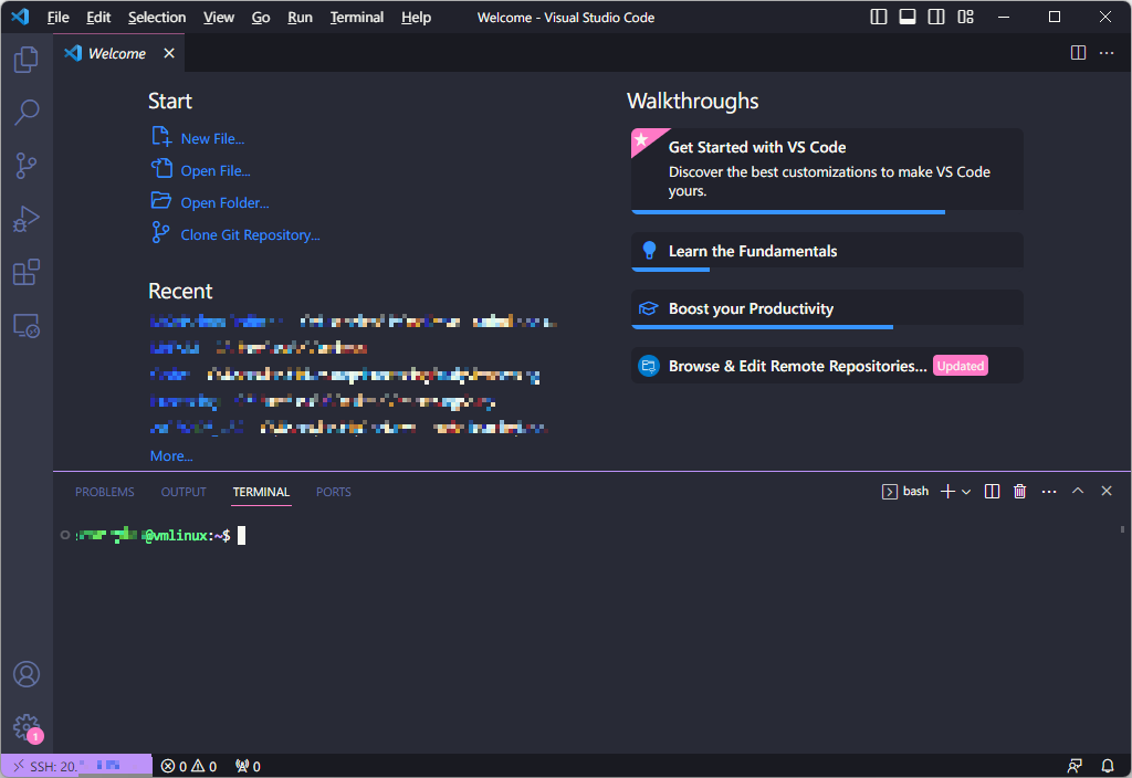 - 터미널을 열면(@[Ctrl]@ + @[Shift]@ + @[`]@) 자동으로 원격 리눅스 VM으로 연결이 되는 것을 확인할 수 있다.