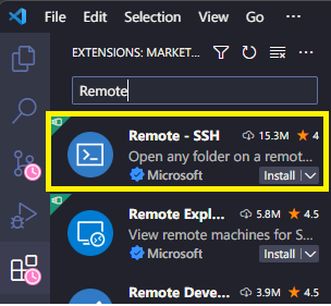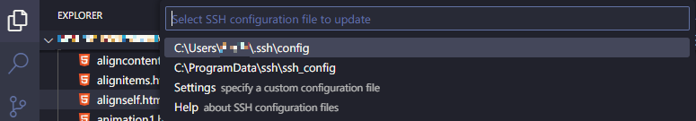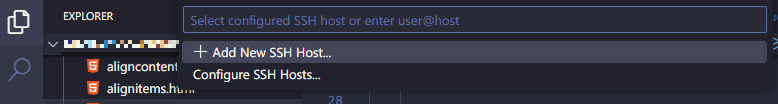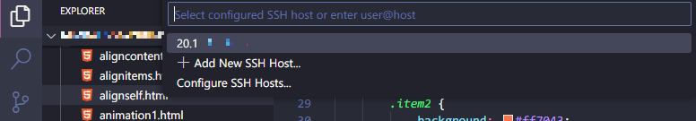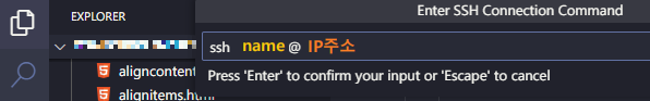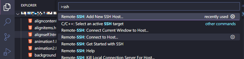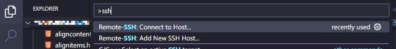 - 다시 @[F1]@(또는 @[Ctrl]@ + @[Shift]@ + @[P]@)을 누르고 @ssh@를 입력하여 @Remote-SSH: Connect to Host...@ 항목을 클릭한다.