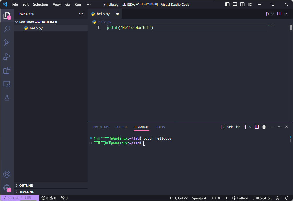 - VS Code에서 원격 리눅스 VM에 연결한 상태에서, 터미널을 통해 디렉터리와 파일을 생성해본다.