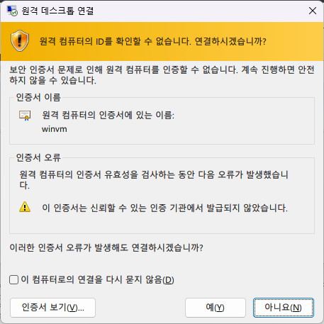 - 경고창이 뜨면 무시하고 [예(Y)] 버튼을 누른다.