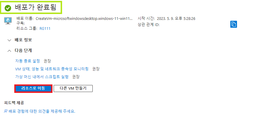 - 배포가 완료되면 [리소스로 이동] 버튼을 클릭한다.