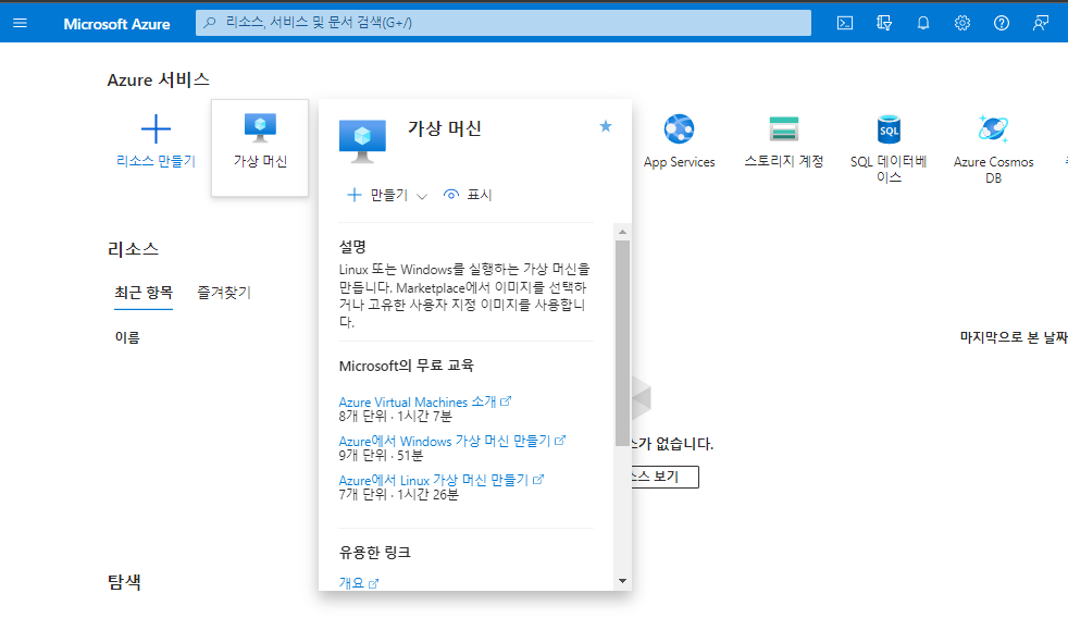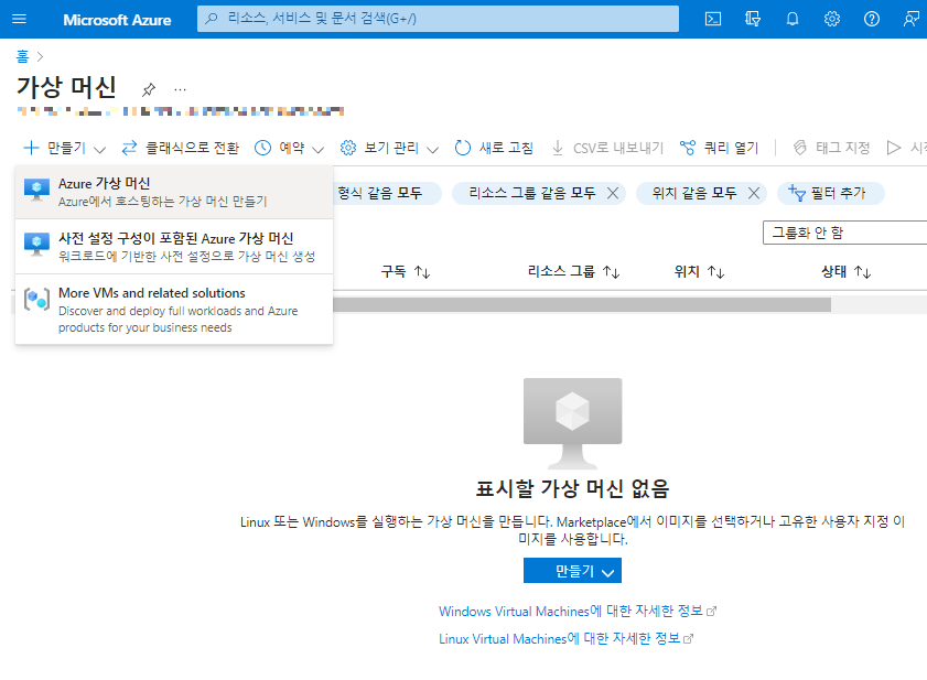 - 리소스 그룹을 생성한 후, [가상 머신] 서비스에 접속한다.
