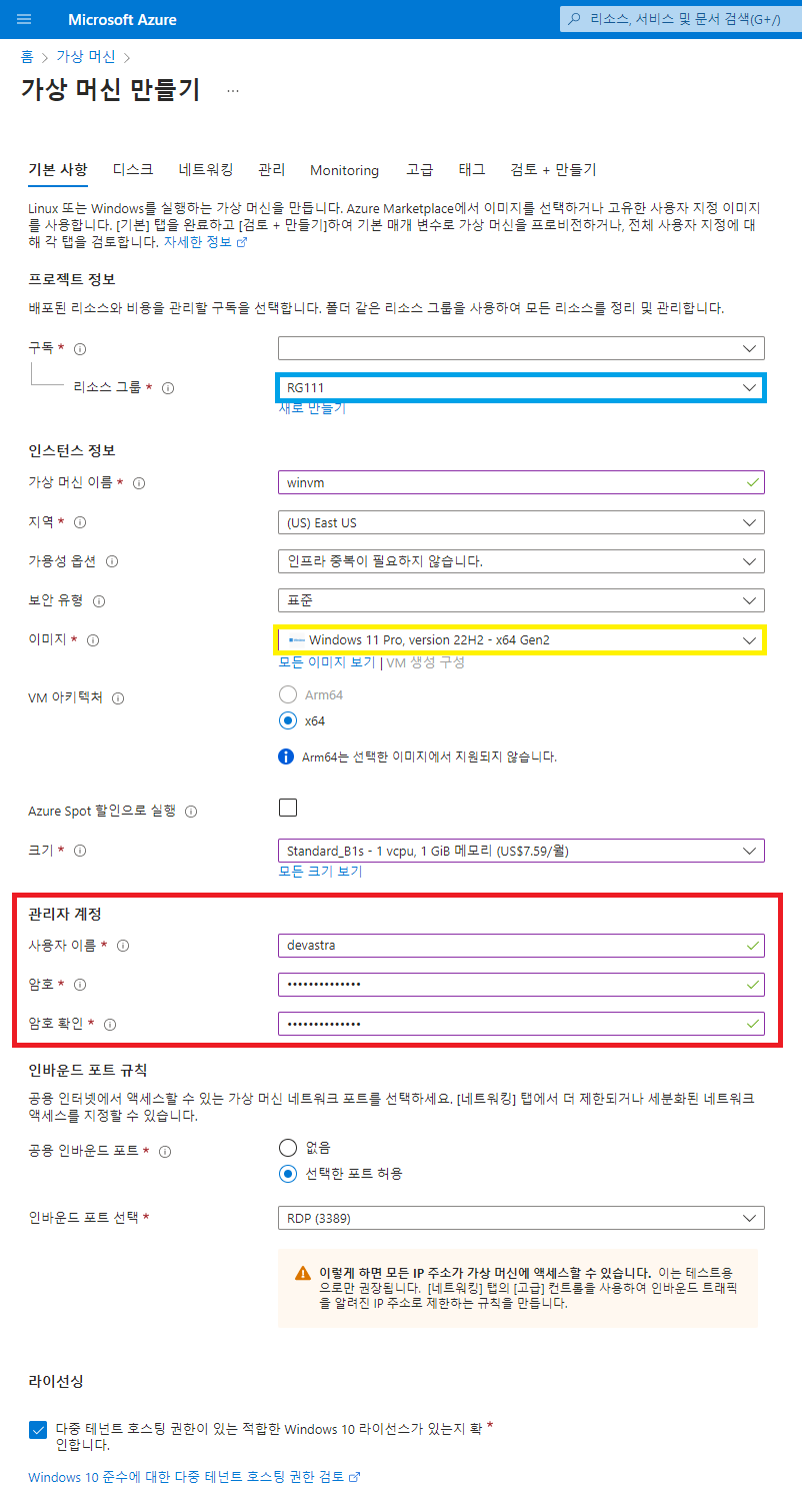 - 리소스 그룹은 생성했던 <리소스 그룹>을 선택하고, 이미지는 [Windows]를 선택해준다.