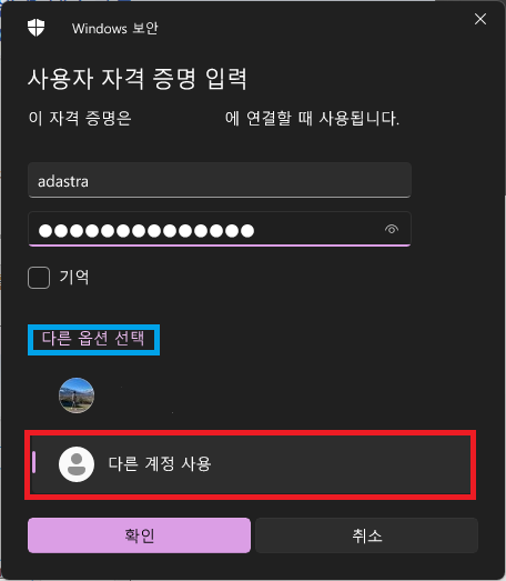- [다른 옵션 선택] 항목을 선택한 후, [다른 계정 사용]을 클릭한다. 그리고 Azure에서 Windows VM을 생성할 때 적었던 관리자 계정의 아이디와 비밀번호를 적어준다.