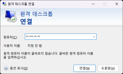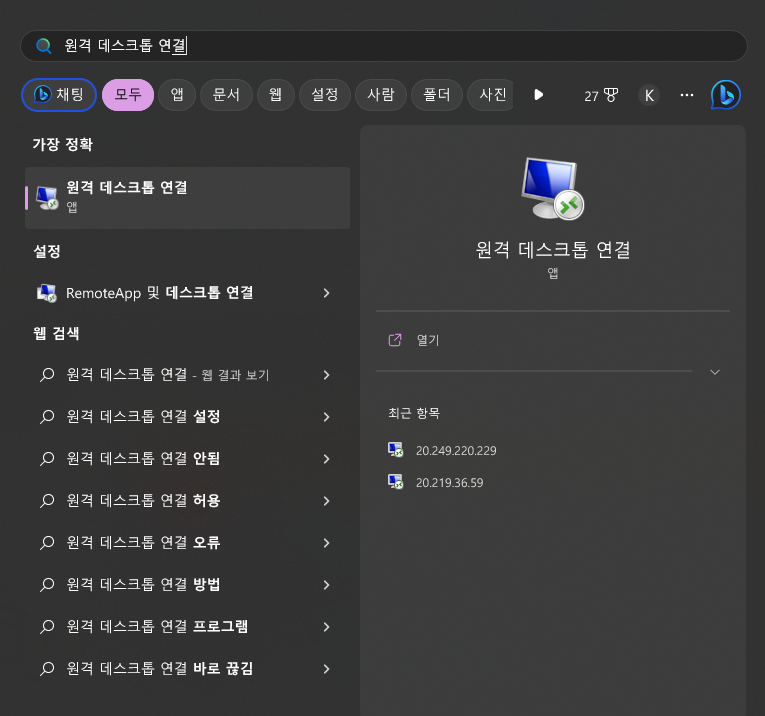 - 검색을 통해 @원격 데스크톱 연결@ 프로그램을 찾아 실행시킨다.
