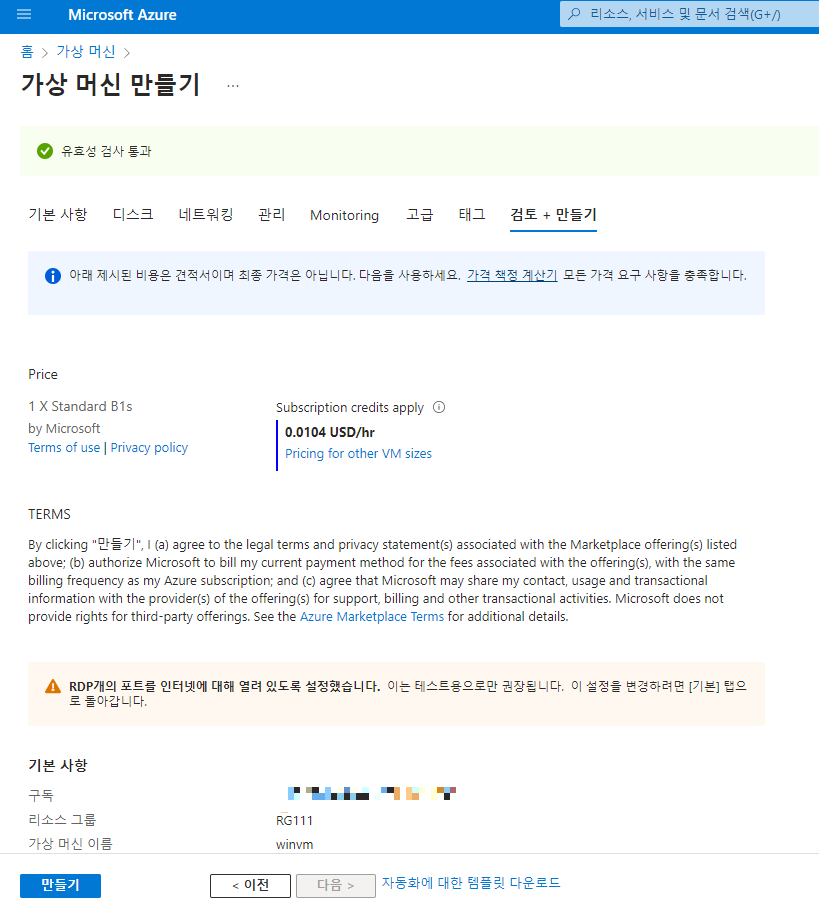 - 마지막의 라이선싱 항목의 체크 박스를 체크해주고 [검토 + 만들기] 버튼을 클릭한다.