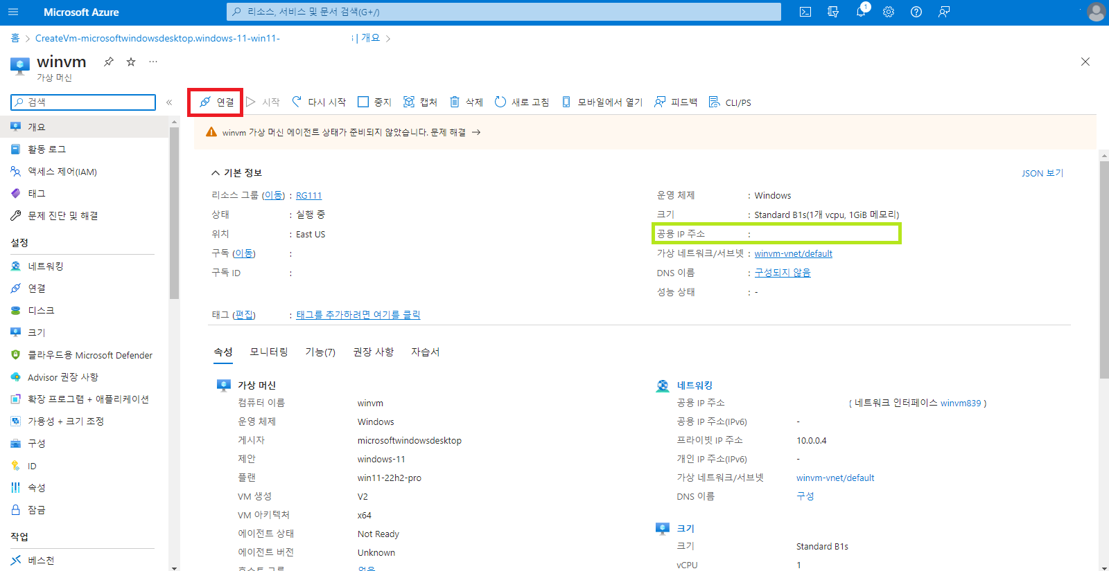 - 생성한 가상 머신 리소스의 페이지가 뜨게 된다. 상단의 [연결] 버튼을 누른다.