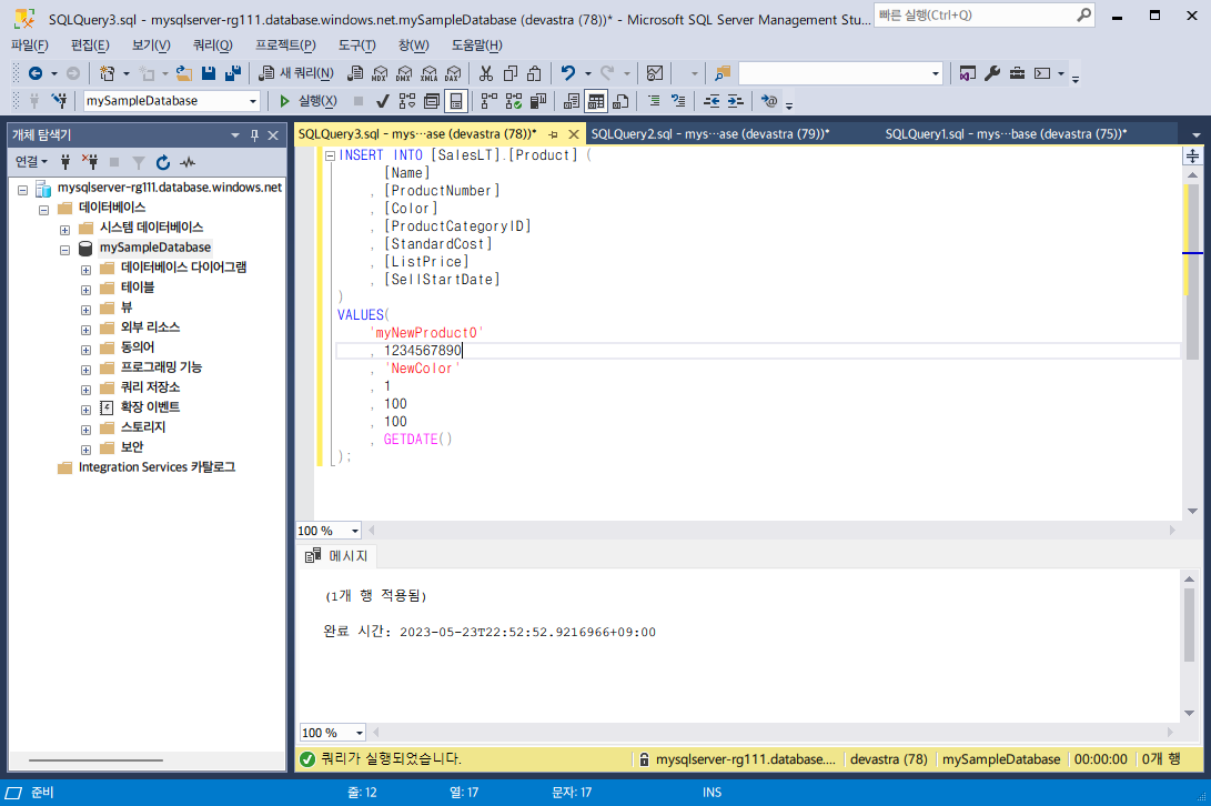 - 개체 탐색기에서 @mySampleDatabase@를 마우스 오른쪽 버튼으로 클릭한 후, @[새 쿼리]@를 선택한다. 데이터베이스에 연결된 새 쿼리 창이 열린다.