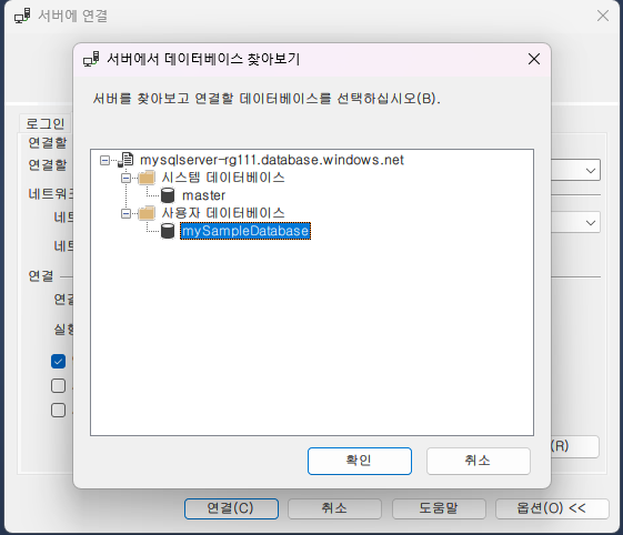 - 서버에 연결(Connect to Server) 대화 상자에서 [옵션(Options)] 버튼을 클릭한 후, 드롭 다운 메뉴에서 @mySampleDatabase@를 선택(찾아보기) 한다.