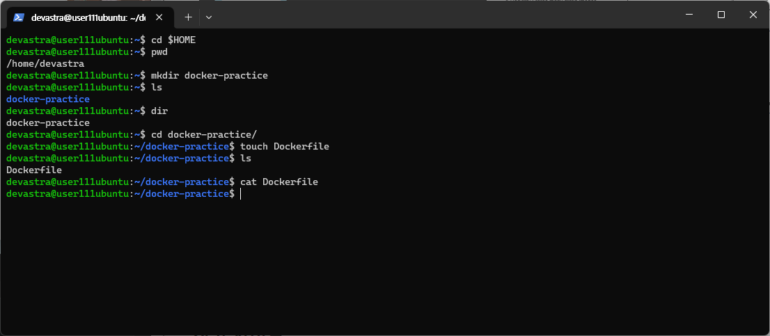 - 다음과 같이 홈 디렉터리(@$HOME@)로 이동한 후, @docker-practice@ 디렉터리를 생성하고, 그 안에 @Dockerfile@ 파일을 만든다.