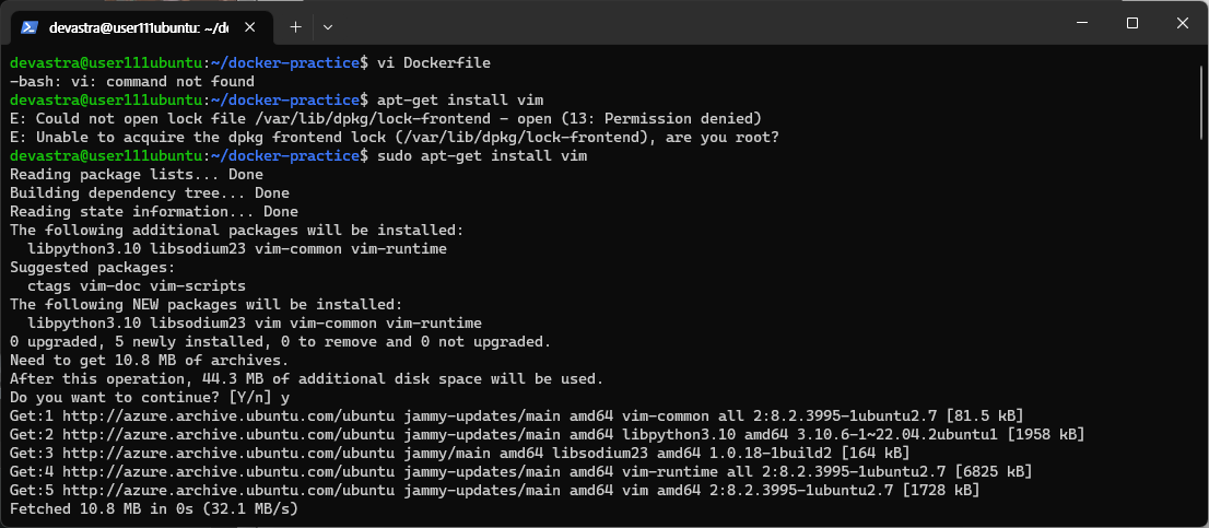 - 도커에 @vi@가 설치되어 있지 않아 @vi@ 명령문이 발견되지 않았다는 안내문이 출력될 수 있다.