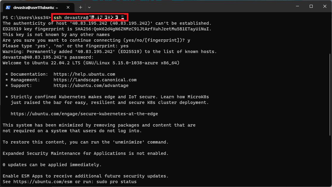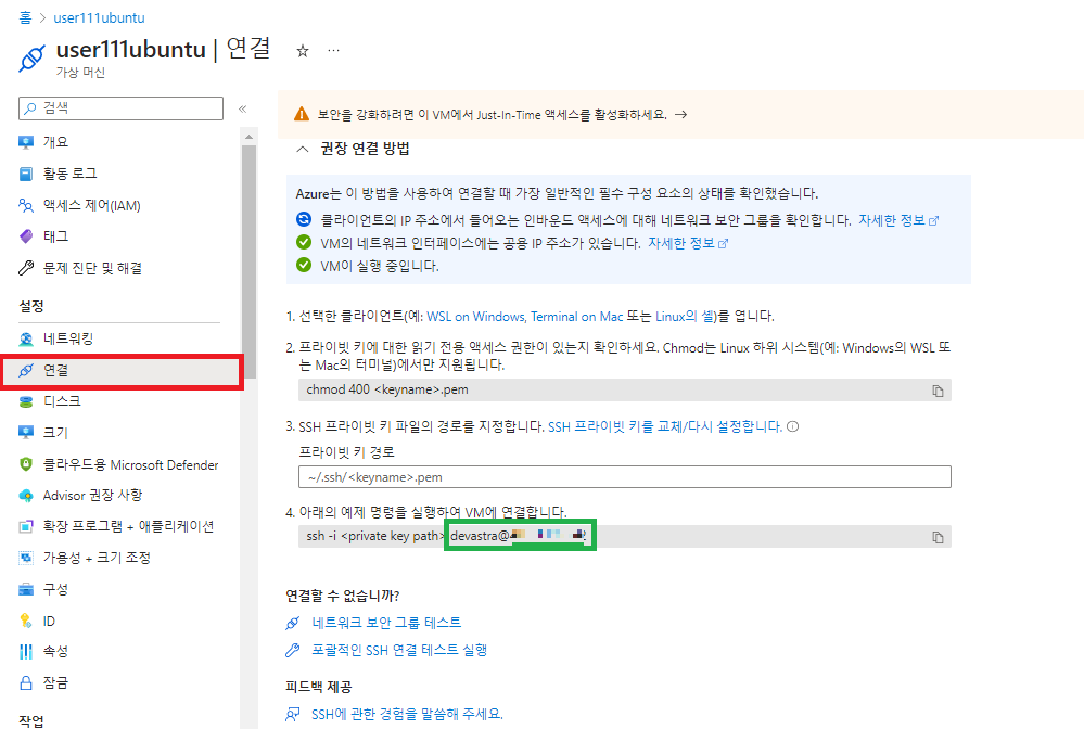 - 터미널에서 아래의 명령을 입력하여 애저에 올린 우분투 VM에 접속한다.