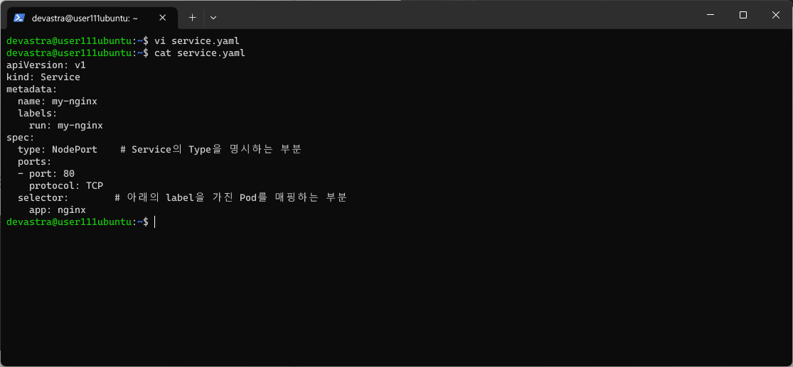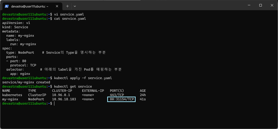 - 다음의 명령을 실행하여 Service를 생성한다.