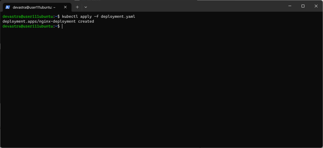 - 다음 명령을 실행하여 생성한 @deployment.yaml@ 파일을 배포해본다. 이 명령을 실행함으로써 파일 내부의 컨테이너가 생성된다.