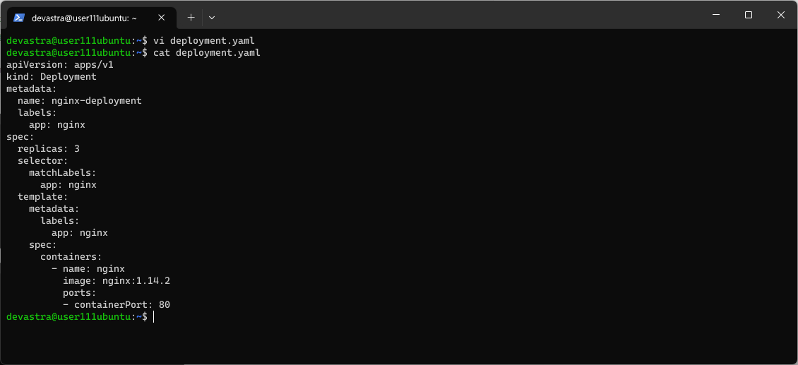 - 다음 명령을 실행하여 @deployment.yaml@ 파일을 생성한 후 내용을 편집해준다. 그리고 파일의 내용을 확인해본다.