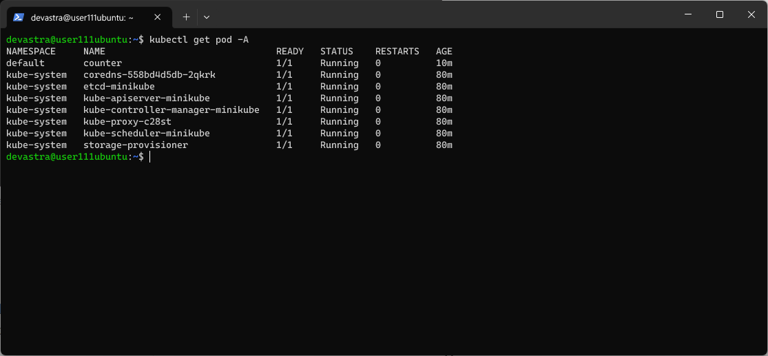 - 다음 명령을 실행하여 실행 중인 Pod의 목록을 확인한다.