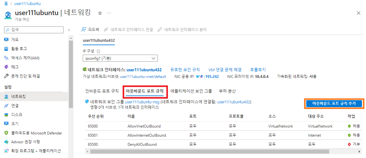 - @[아웃바운트 포트 규칙]@ 탭을 클릭한 후, @[아웃바운드 포트 규칙 추가]@ 버튼을 클릭한다.