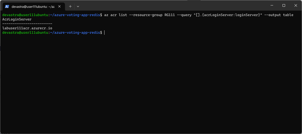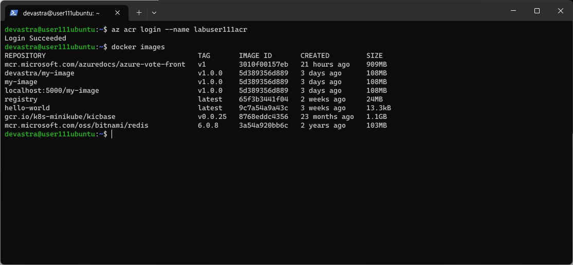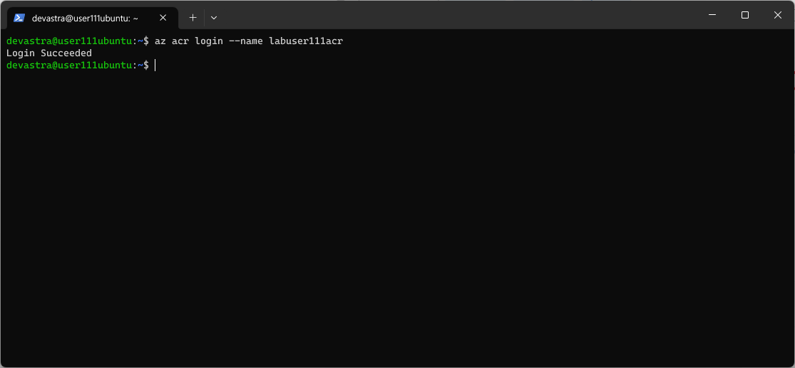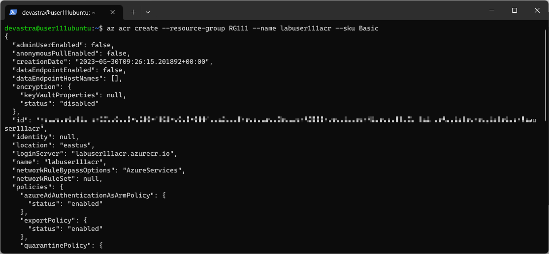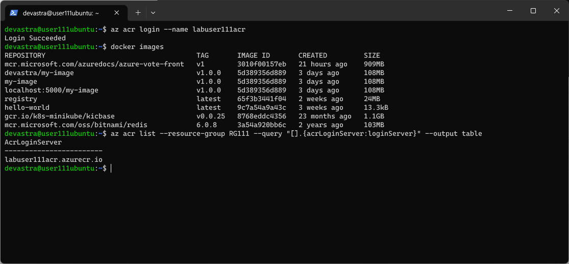 $ az acr create --resource-group RG111 --name labuser111acr --sku Basic