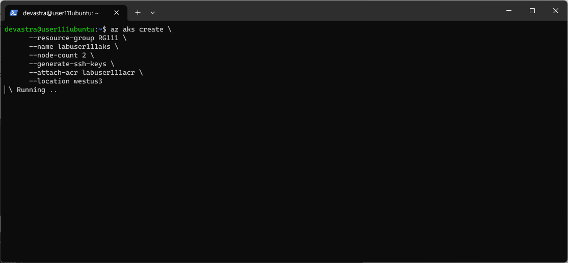 - 다음 명령을 실행하여 AKS(Azure Kubernetes Service) 클러스터를 생성한다. 본인의 리소스 그룹(@RG111@)에 @labuser111aks@라는 AKS 클러스터를 만든다. (@westus3@ 지역에 배포한다.)