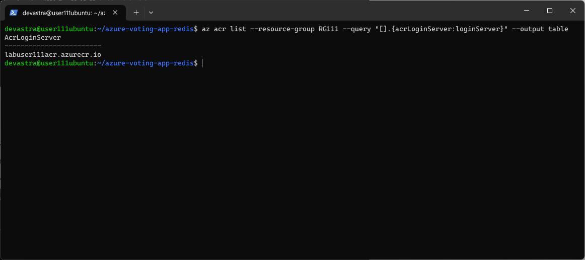 $ az acr list --resource-group RG111 --query "[].{acrLoginServer:loginServer}" --output table