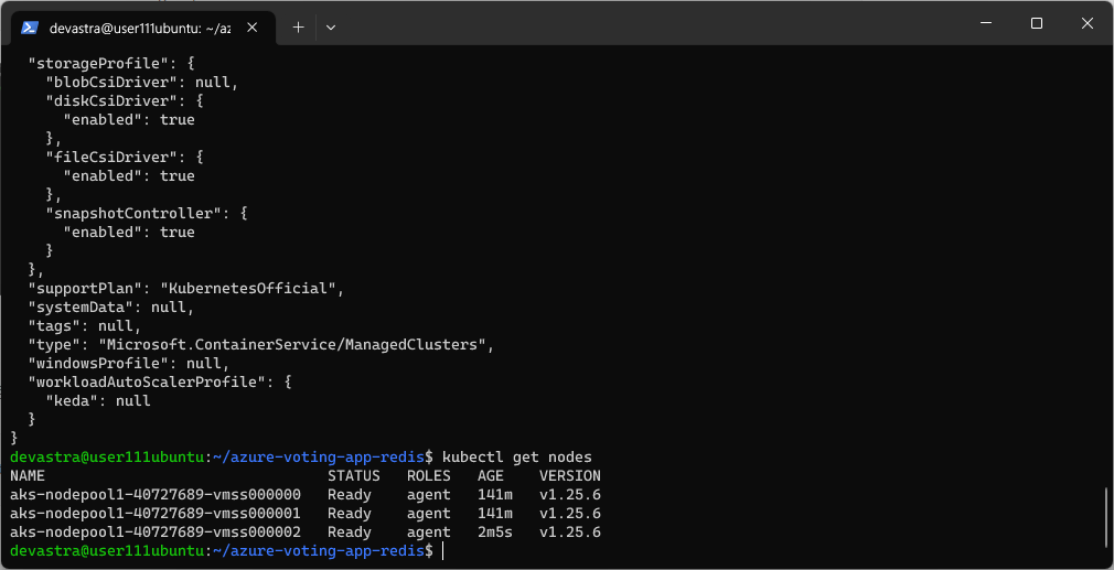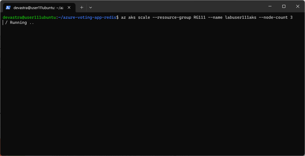 $ az aks scale --resource-group RG111 --name labuser111aks --node-count 3