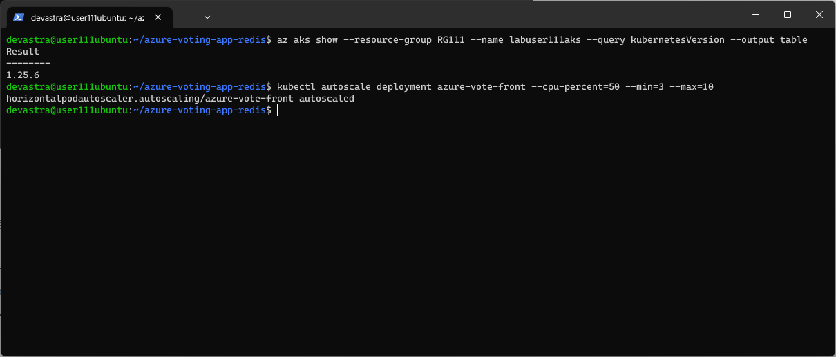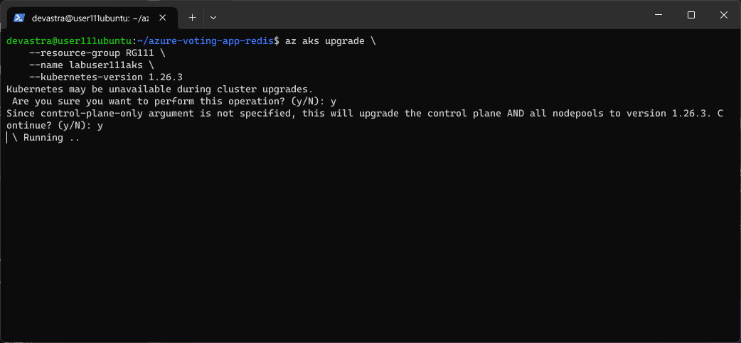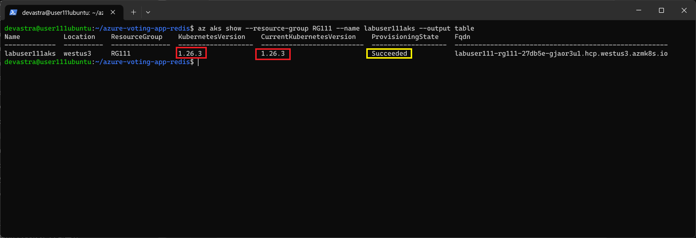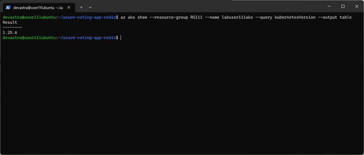$ az aks show --resource-group RG111 --name labuser111aks --query kubernetesVersion --output table