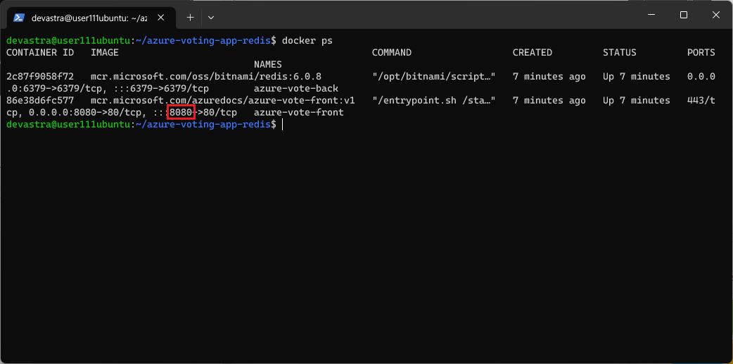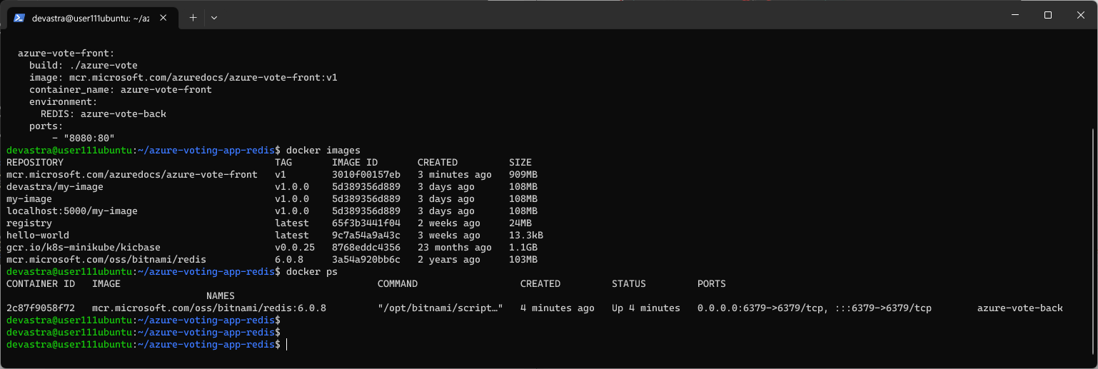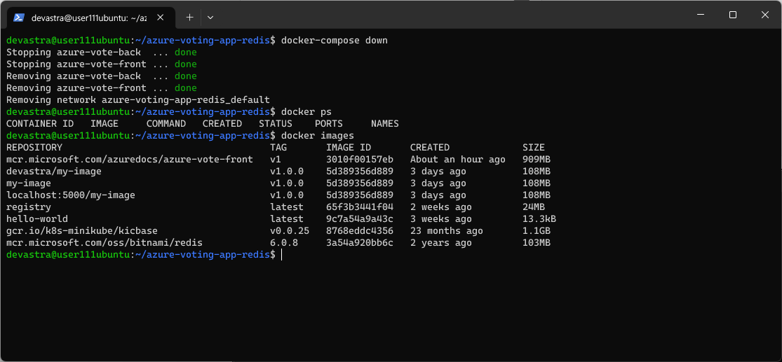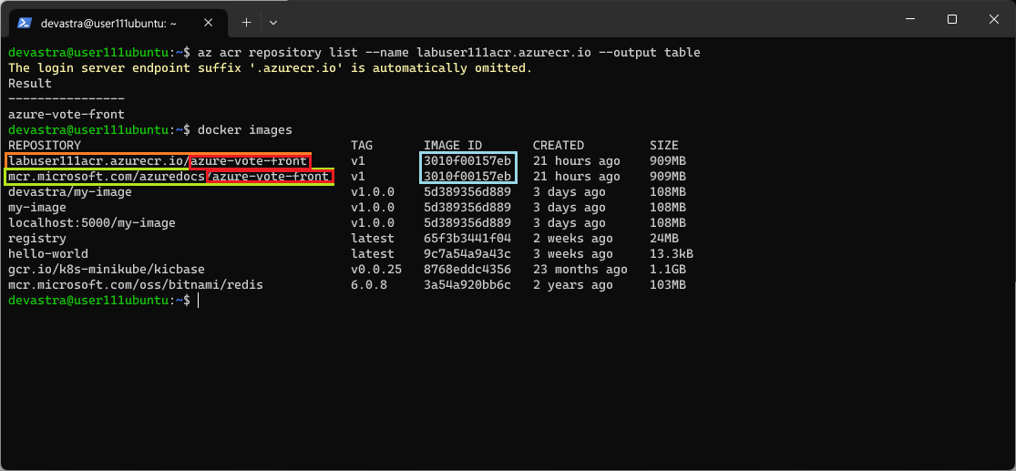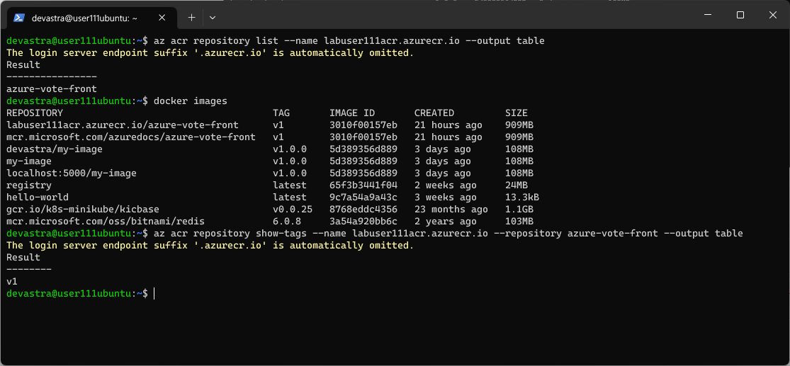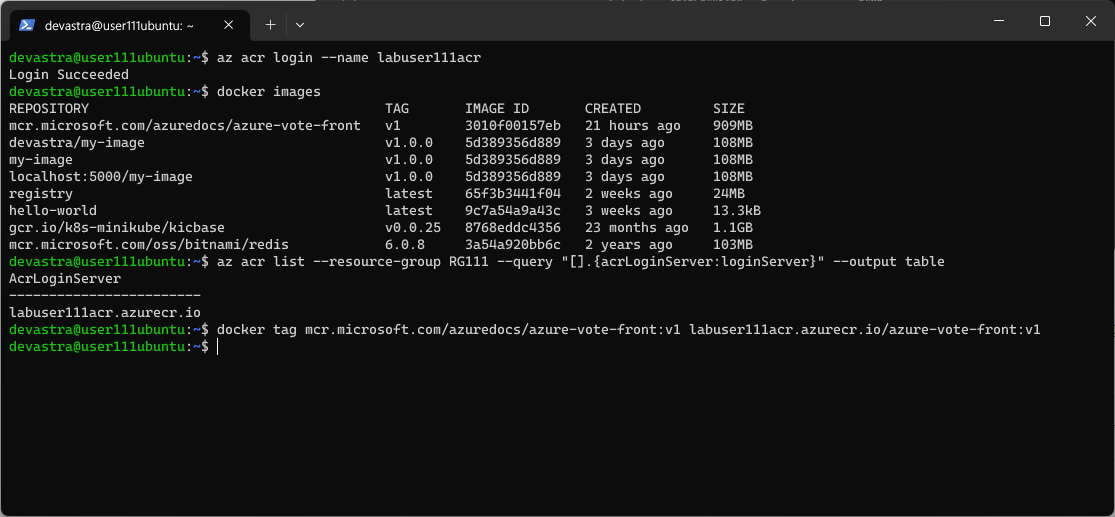 $ docker tag mcr.microsoft.com/azuredocs/azure-vote-front:v1 labuser111acr.azurecr.io/azure-vote-front:v1