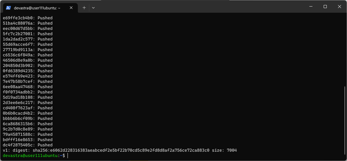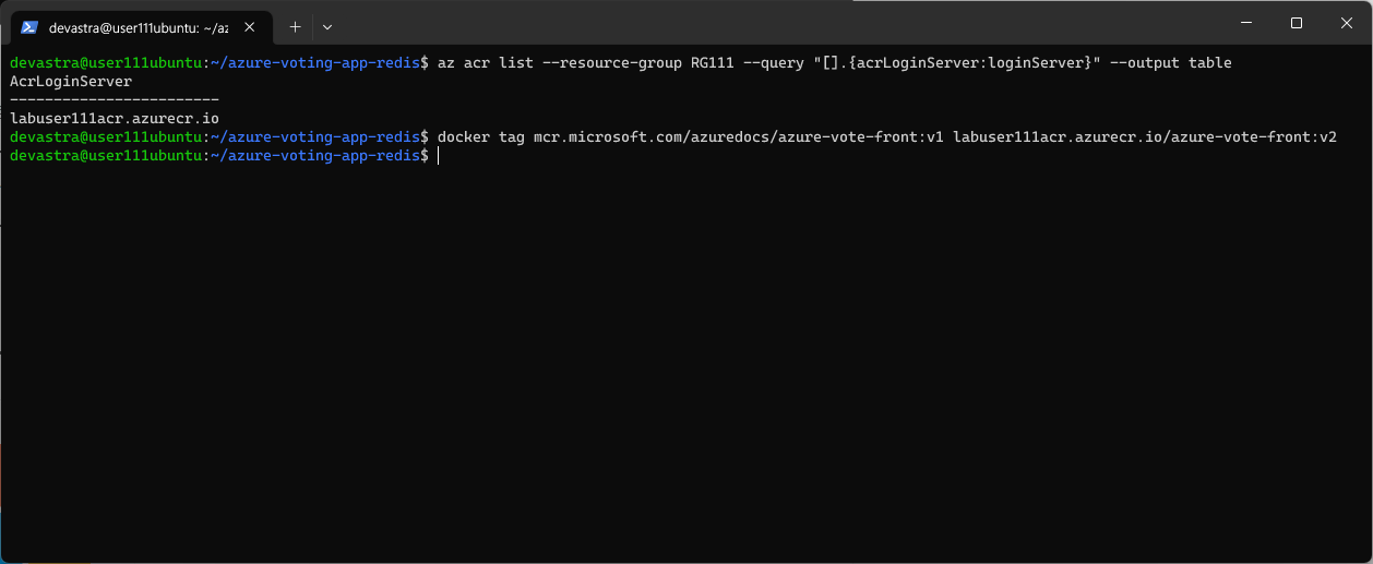 $ docker tag mcr.microsoft.com/azuredocs/azure-vote-front:v1 labuser111acr.azurecr.io/azure-vote-front:v2