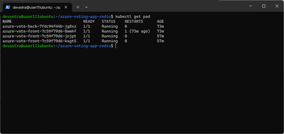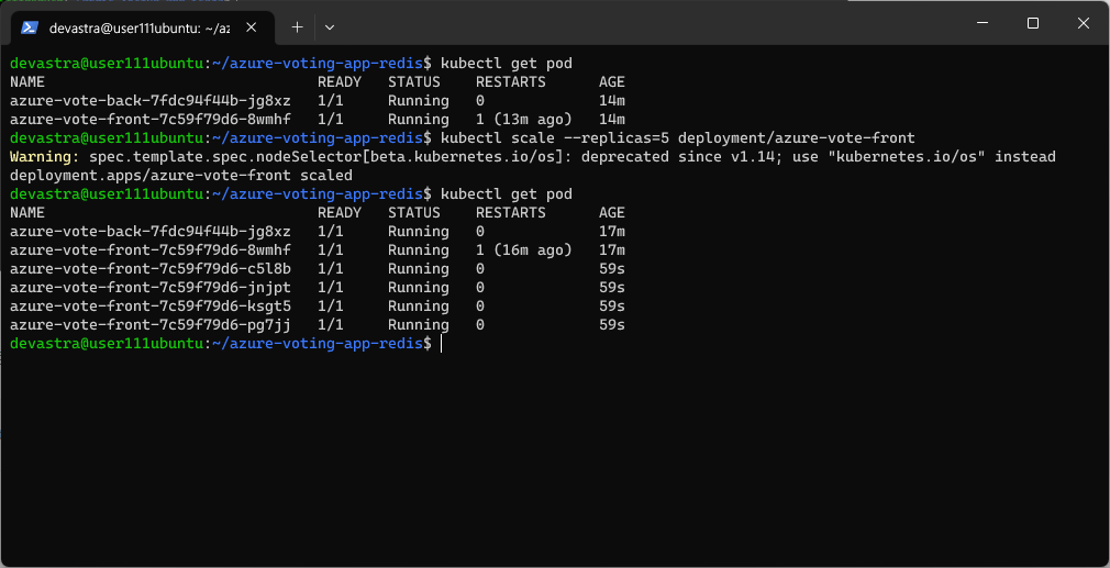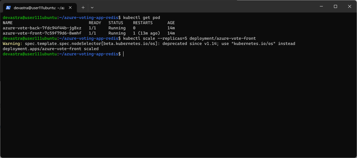 최대의 작동 시간을 제공하려면 애플리케이션의 Pod의 인스턴스가 여러 개 있어야 한다. 프런트 엔드의 Pod가 하나만 있는 경우, 'kubectl scale --replicas=3 deployment/azure-vote-front' 명령을 실행하여 Pod의 개수를 수동으로 3개로 늘려준다.