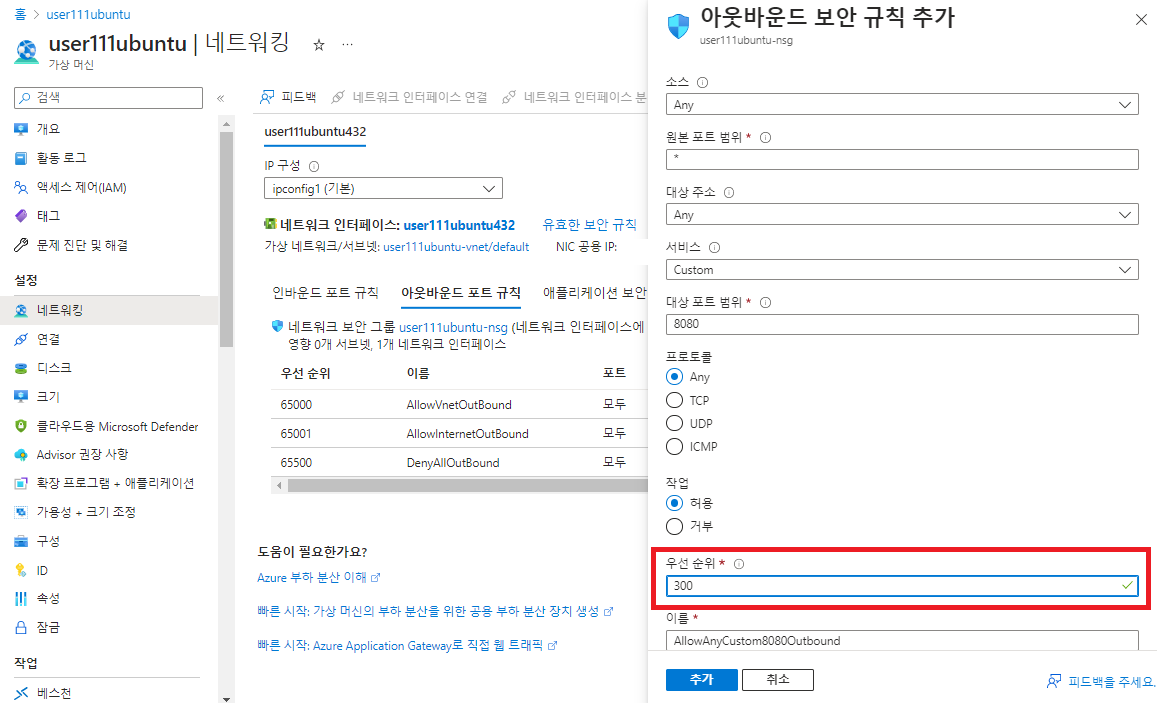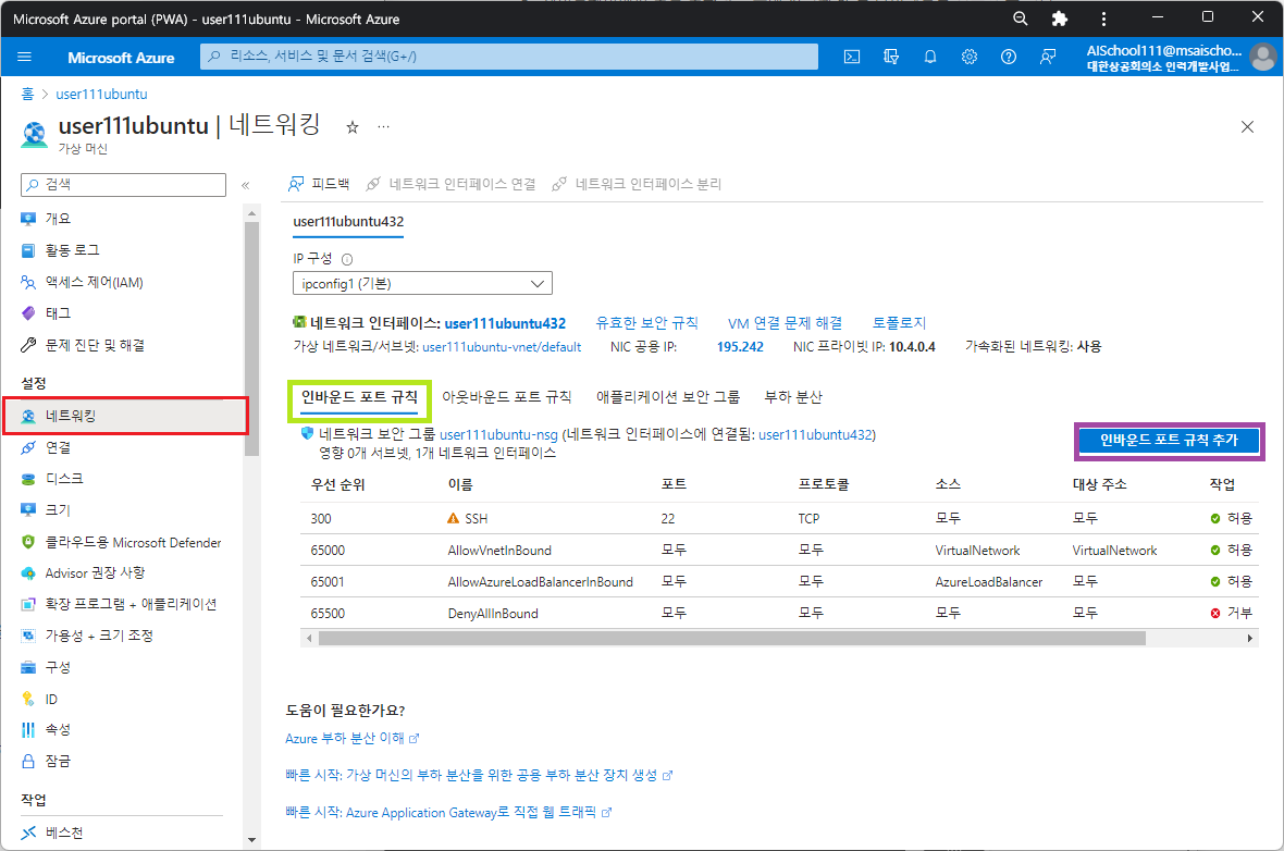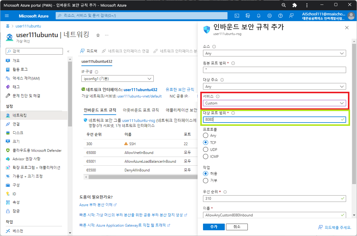 - 해당 주소로 접속하려면 @8080@ 포트에 대해서 접속을 허가해주는 작업을 해주어야 한다. 애저 포털의 우분투 가상머신 리소스 페이지로 진입한다. 그리고 @[네트워킹]@ 탭을 클릭한다. 그리고 @[인바운드 포트 규칙 추가]@ 버튼을 누른다.