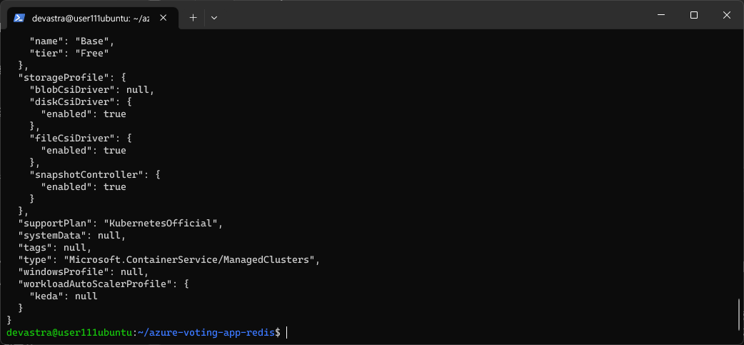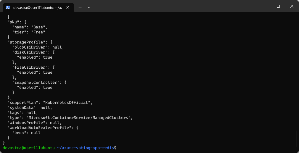 $ az aks show --resource-group RG111 --name labuser111aks --output table