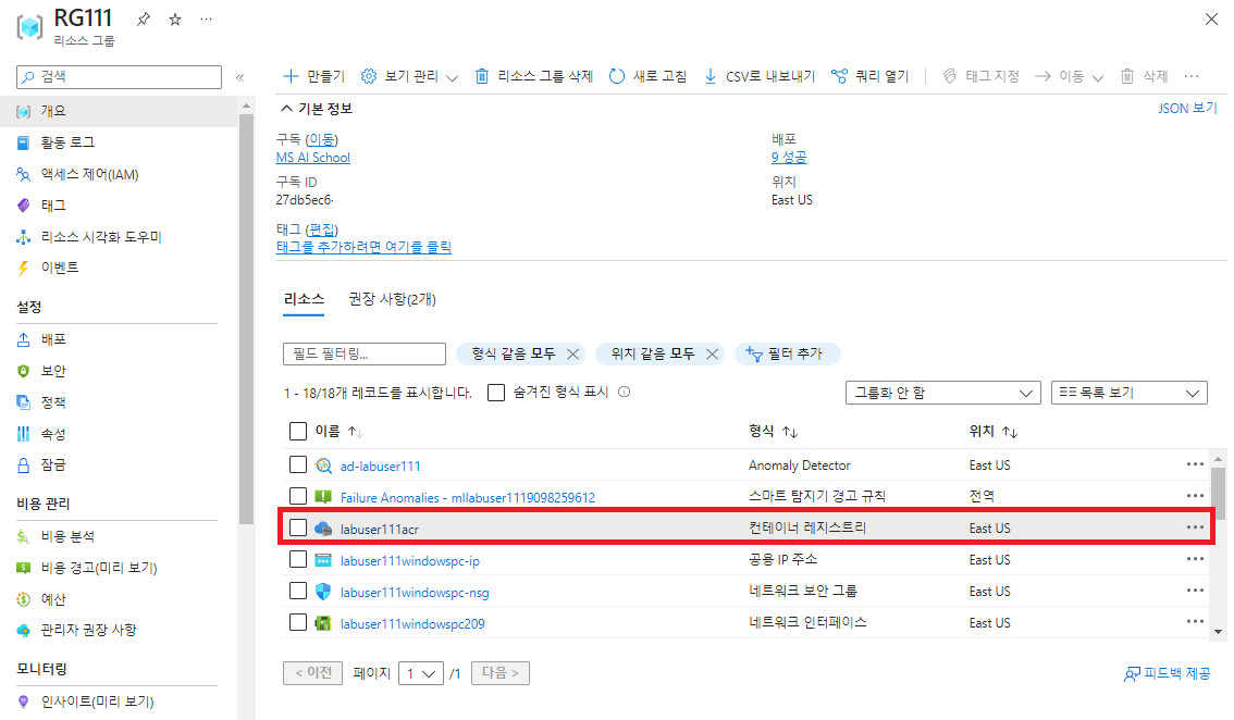 - 애저 포털에서 본인의 리소스 그룹 페이지(@RG111@)에서 ACR이 제대로 생성되었는지 확인해보자.