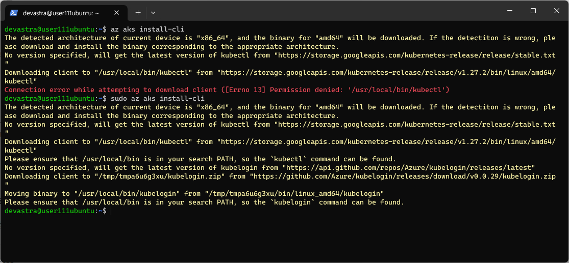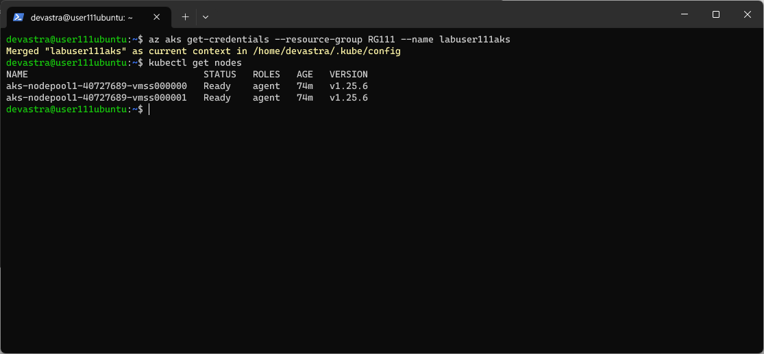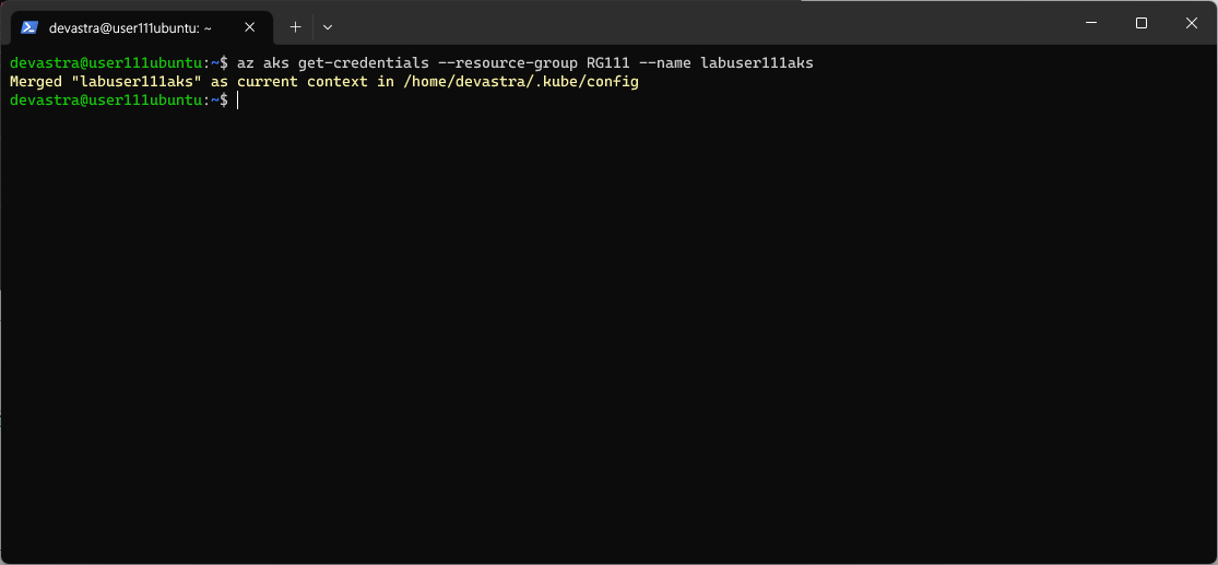 $ az aks get-credentials --resource-group RG111 --name labuser111aks