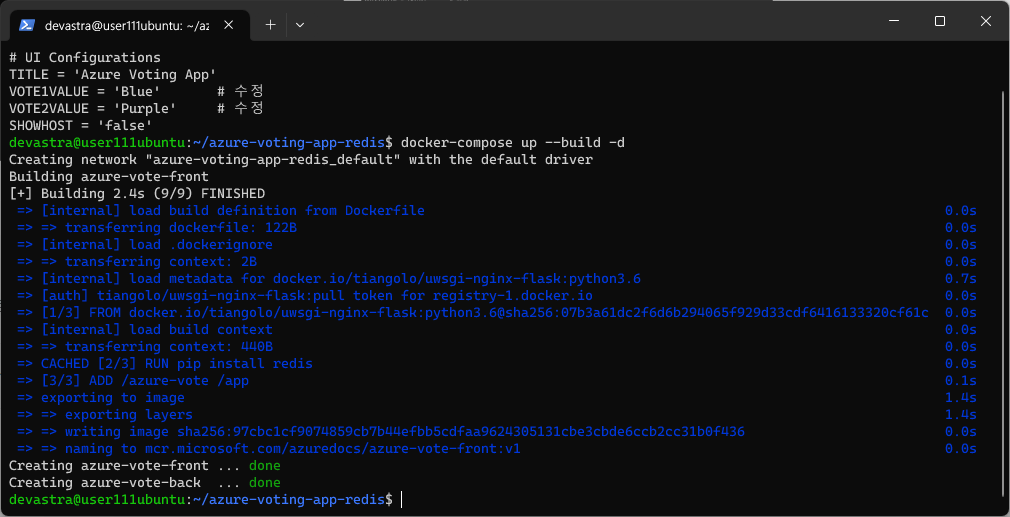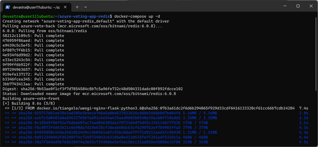- 그리고 다음 명령을 실행한다. 이 명령은 샘플 @docker-compose.yaml@ 파일을 사용하여 컨테이너 이미지를 만들고, @Redis@ 이미지를 다운로드하고, 애플리케이션을 시작한다.